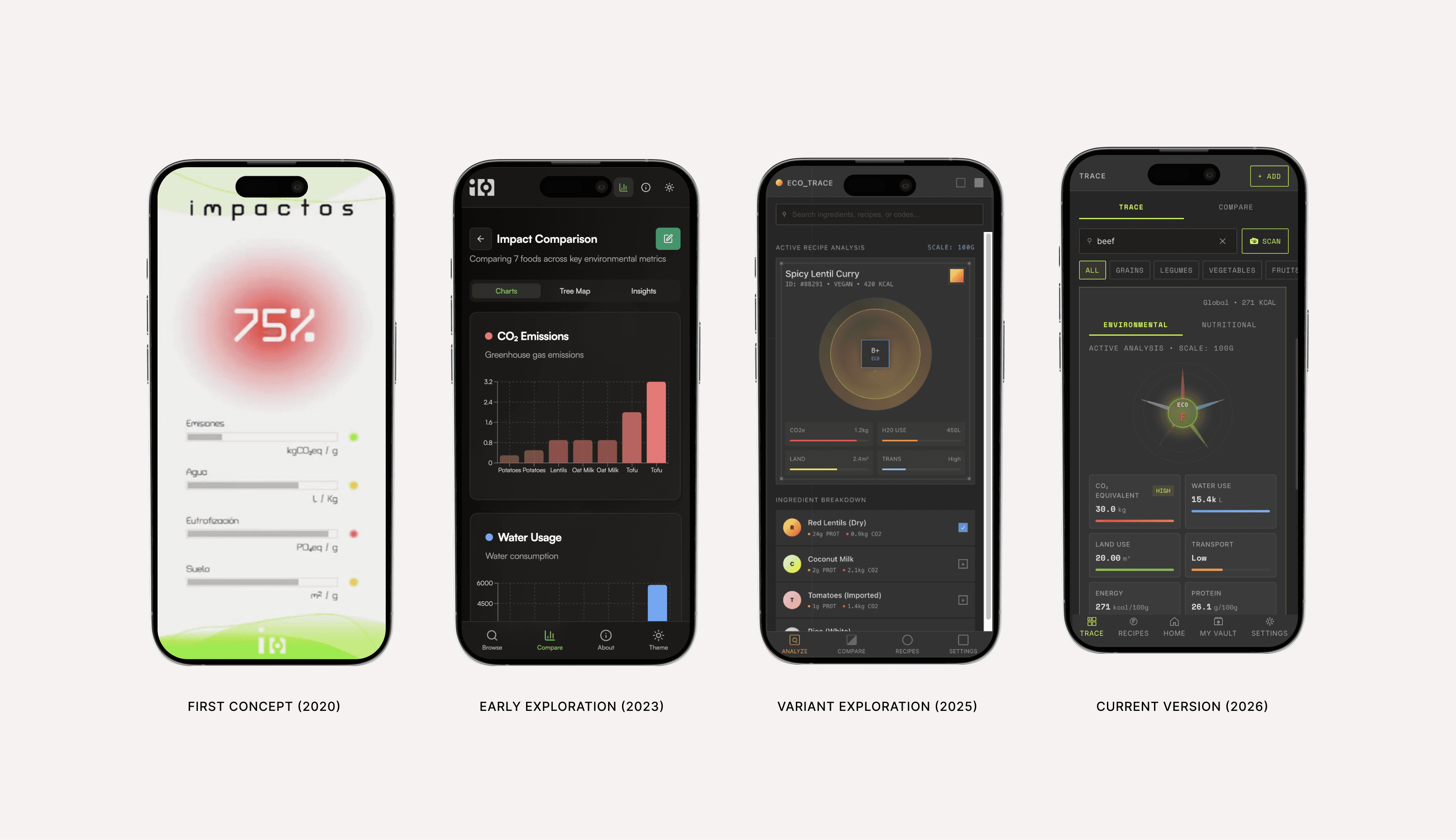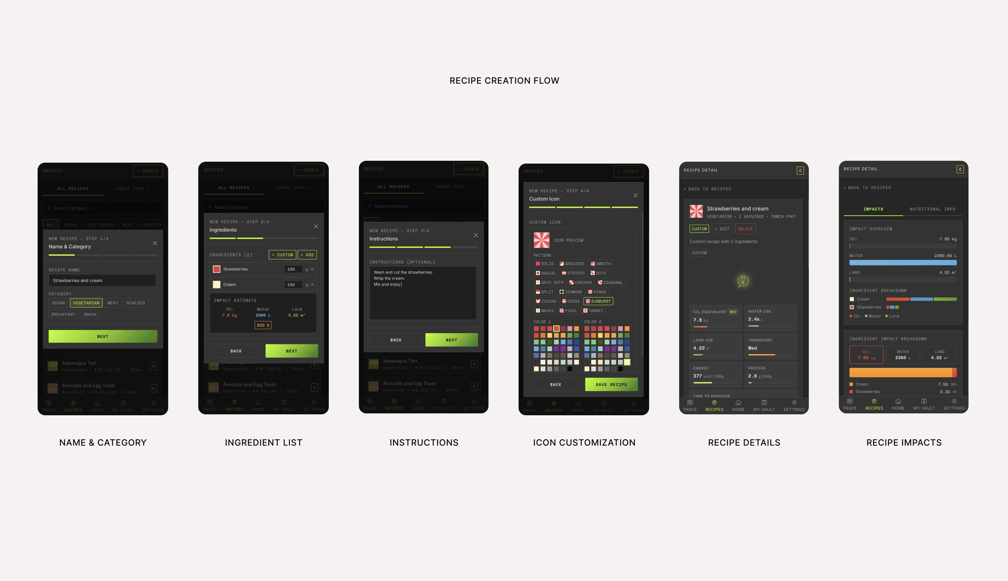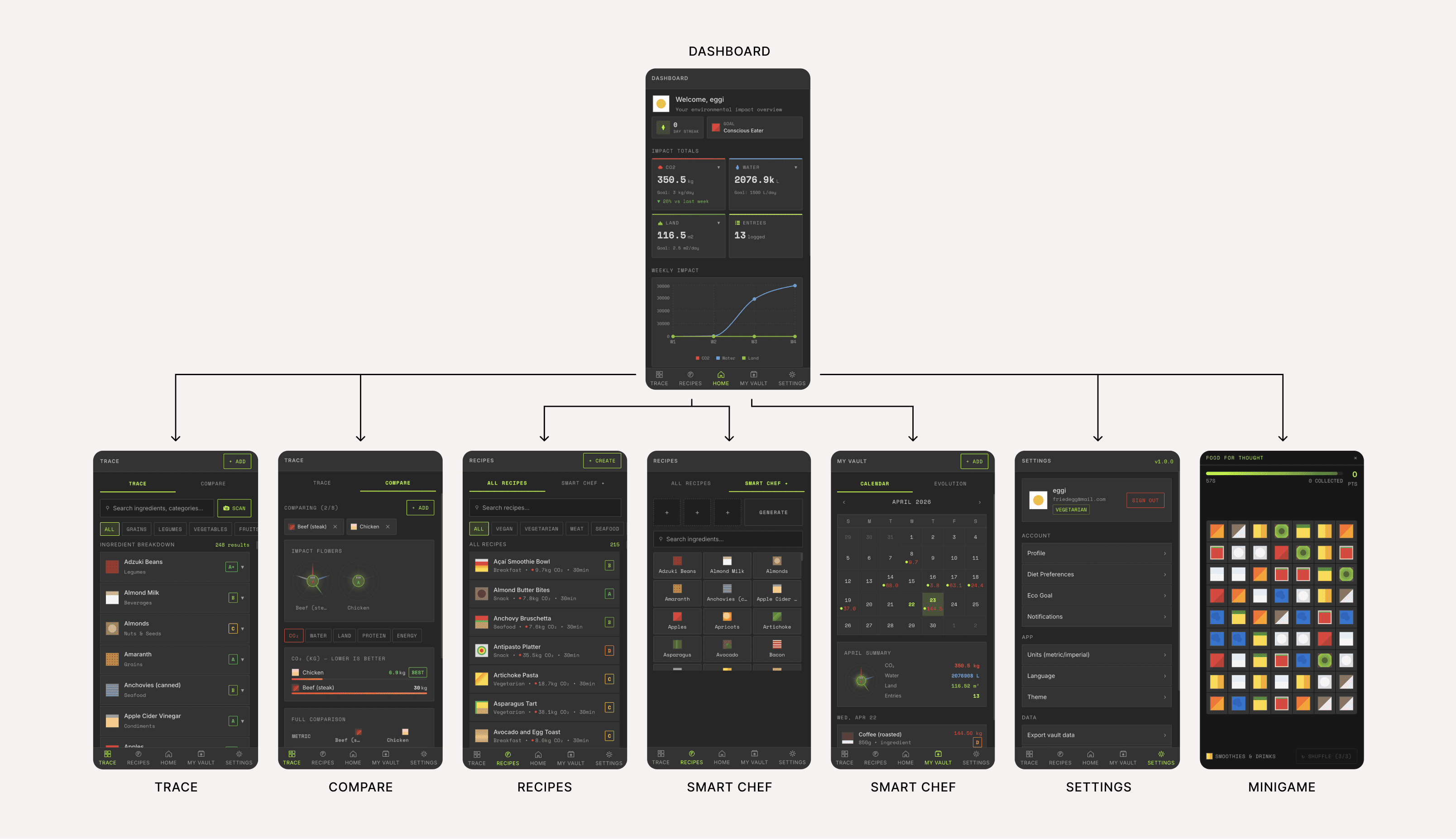 The experience is structured around clarity and progression. Users can trace individual ingredients, compare alternatives, and build a personal “impact profile” over time. Recipes become both functional and exploratory, allowing users to understand not only what they eat, but how it affects the world around them.