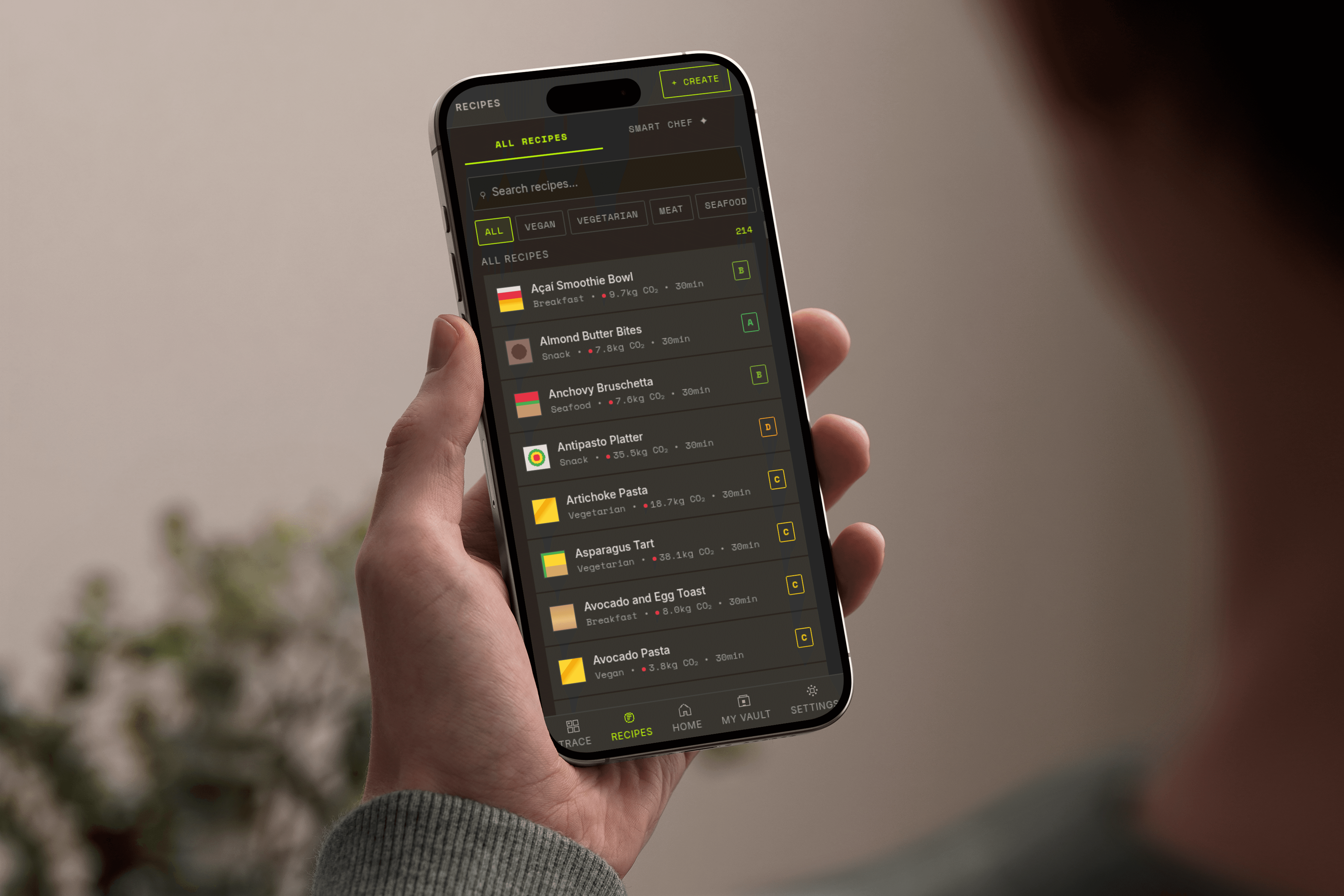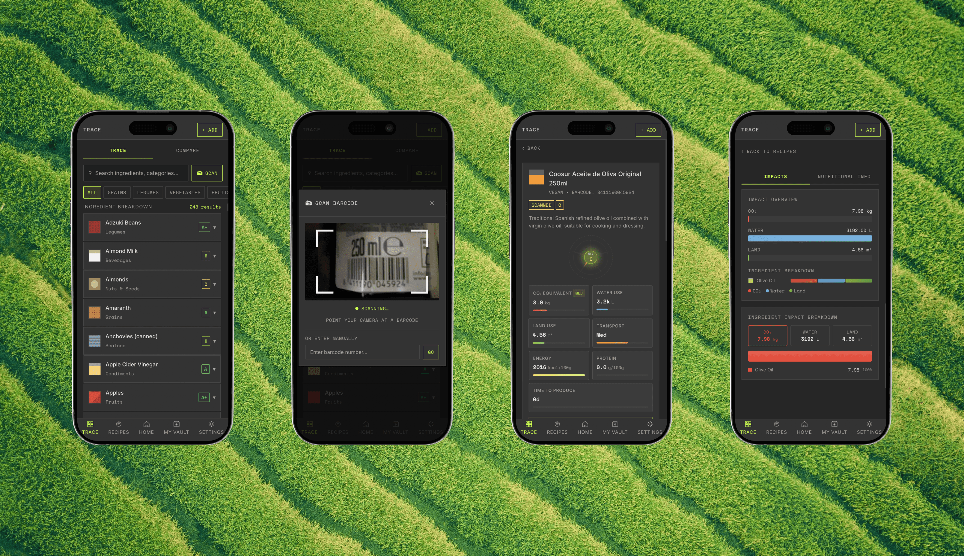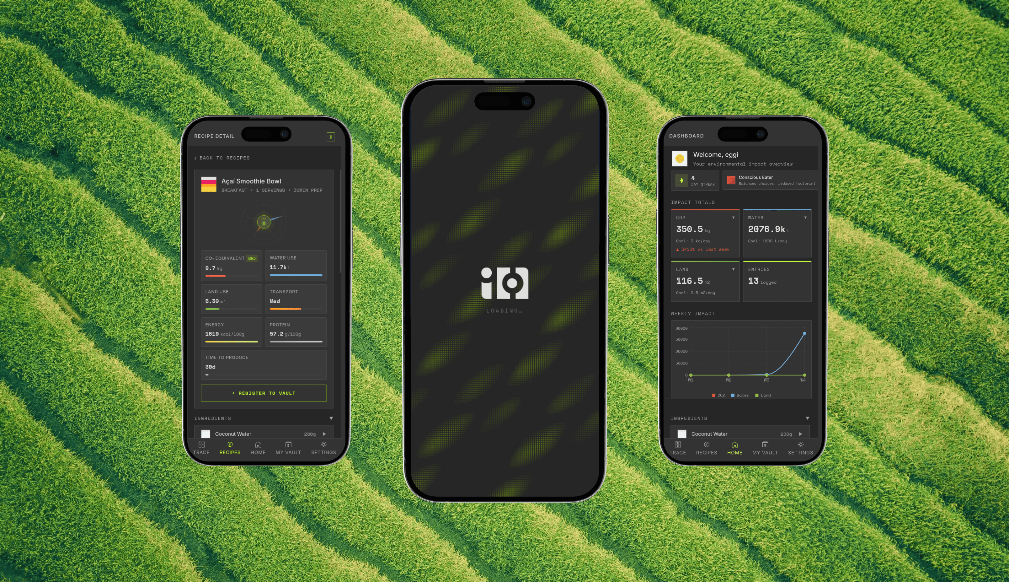 The experience is structured around clarity and progression. Users can trace individual ingredients, compare alternatives, and build a personal “impact profile” over time. Recipes become both functional and exploratory, allowing users to understand not only what they eat, but how it affects the world around them.