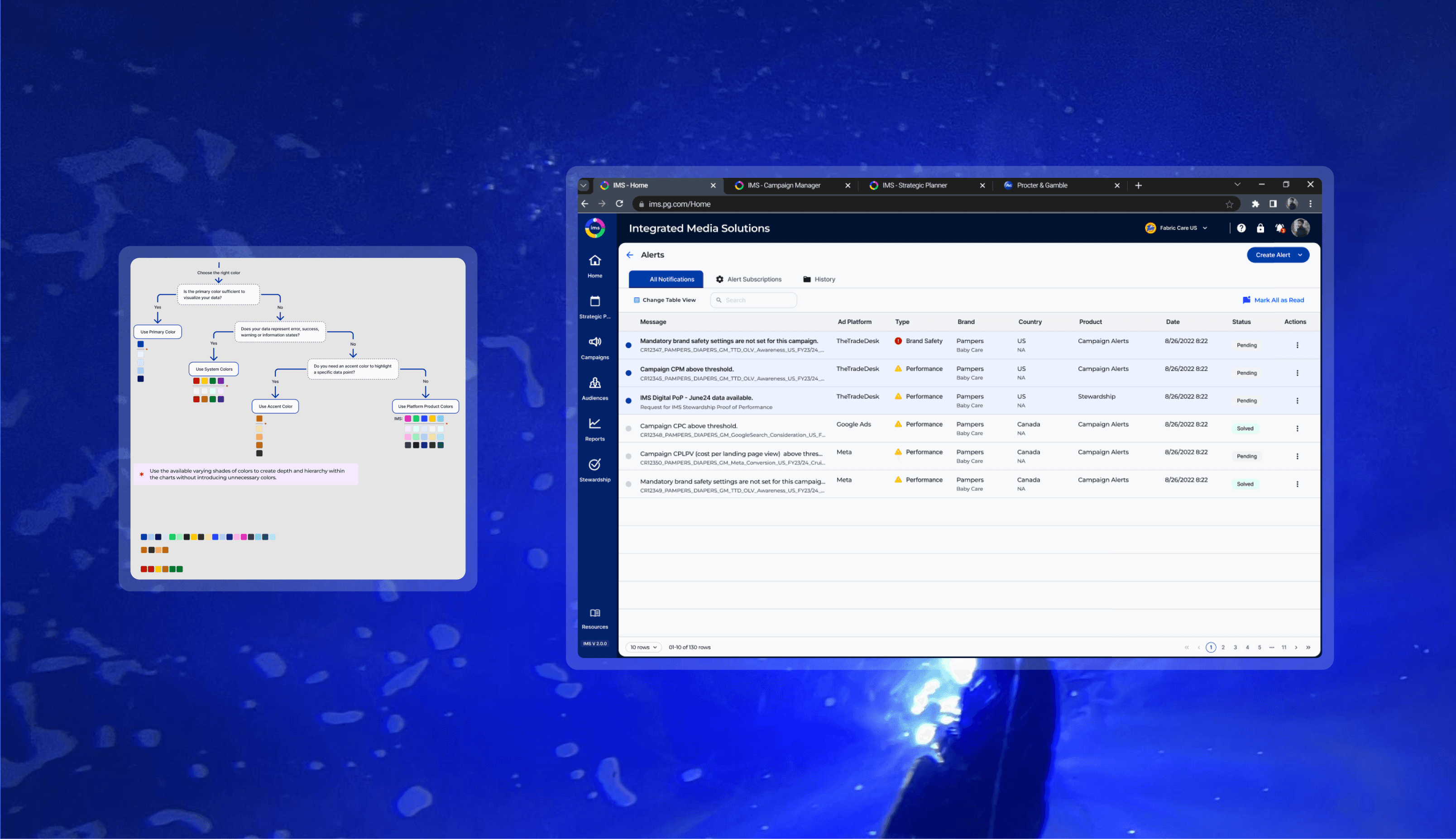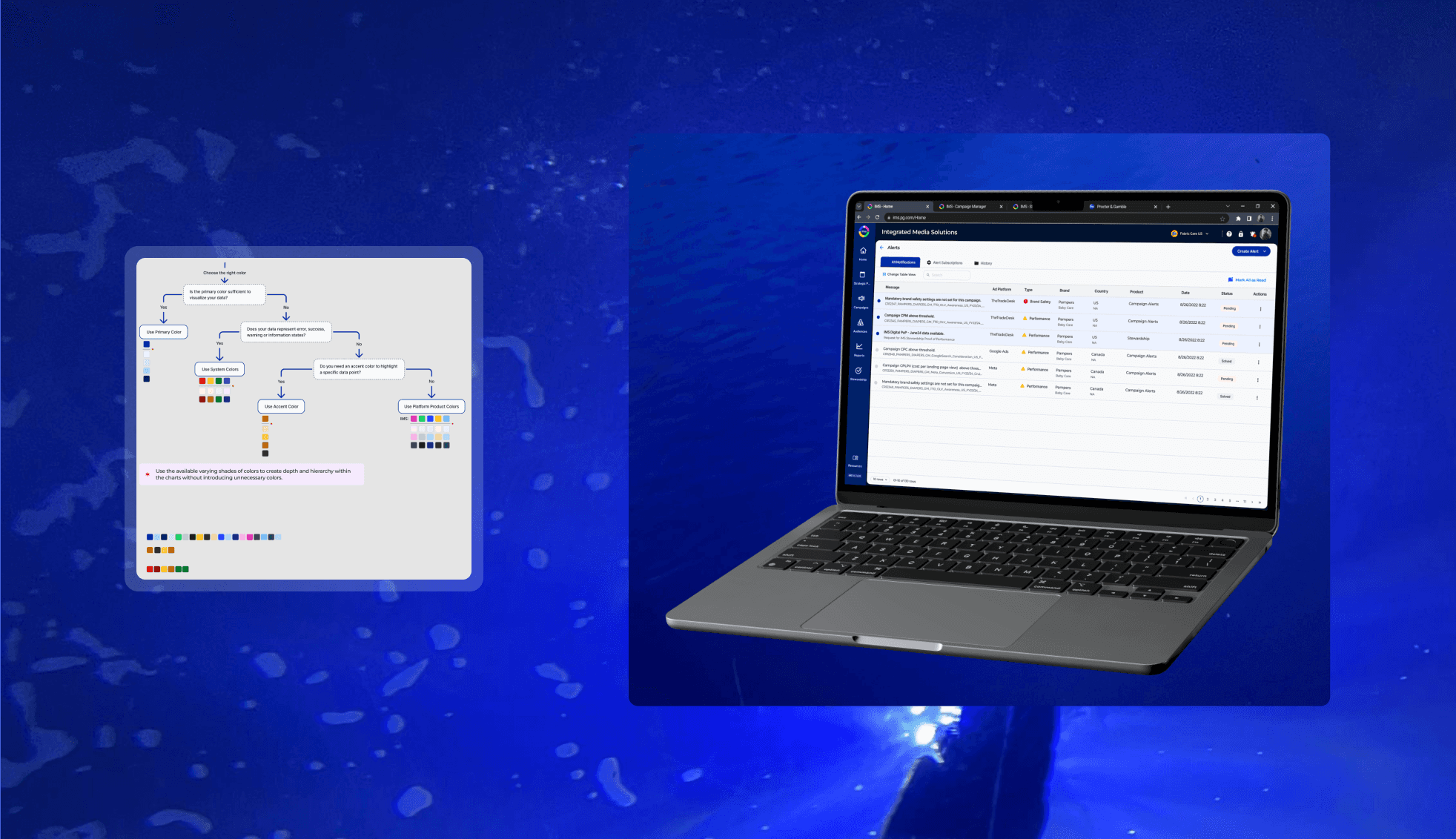 Key efforts included redesigning core flows—such as campaign budgeting and alerts—to improve clarity and usability. At the same time, a data visualization system was developed to standardize how information was presented, including graph structures, color usage, and hierarchy.